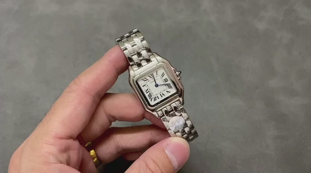 BV – Panthère Medium 27×37 mm This model stands out with its square, double-layered case that brings together elegant and modern lines. The iconic stylized numerals set against a white background give the design a classic appea...