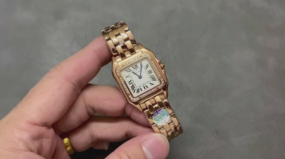 BV – Panthère Medium 27×37 mm This model stands out with its square, double-layered case that brings together elegant and modern lines. The iconic stylized numerals set against a white background give the design a classic appea...