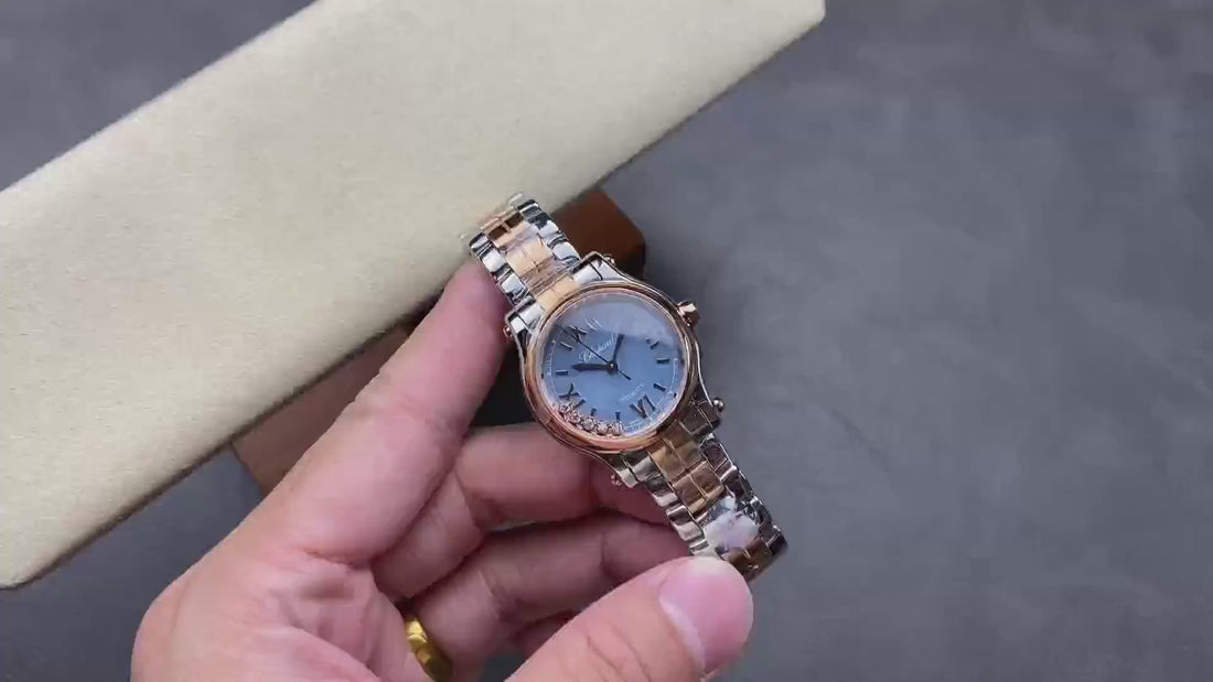This edition features a stunning rose gold case, a blue mother-of-pearl dial, and 5 floating diamonds that move freely with every wrist motion — creating a vibrant and luxurious sparkle.